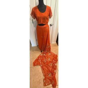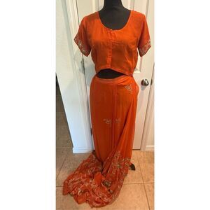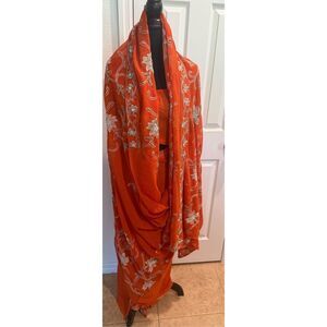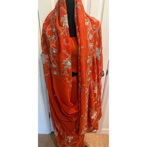 Labeled size 44, skirt has elastic band in back, all measurements in photo, approximate size S. Scarf size is 88" X 42". The label cut off the skirt, all flaws shown in the pictures