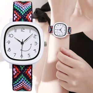 Stylish watch with a colorful woven strap. Features a unique design with vibrant colors.