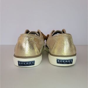 A sparkly take on a Sperry classic, the Gold Sperry Top-Sider is perfect for adding the final touch to your outfit. Leather upper and all the comfort of the same essential sneaker silhouette you know and love and want, along with genuine rawhide laces and barrel ties for easy on/off and a secure fit.