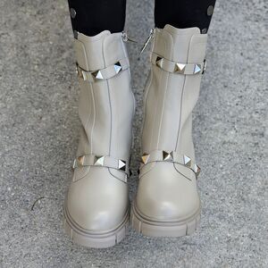 Women's Grey Pyramid Stud Ankle Combat Boot