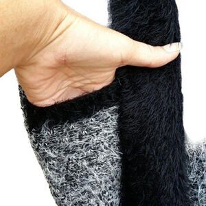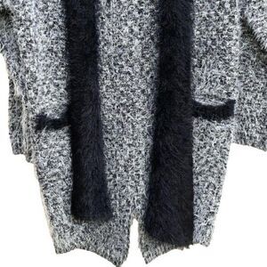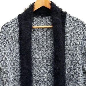 Handmade open front cardigan eyelash duster with large lapel and pockets in black and white with tails in back.