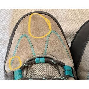 These were worn on an episode of a popular television show by an actress for less than five hours. There is some easily cleaned dirt marks and tiny stains, all which o believe can be removed for an incredible pair of hiking shoes. They are a n great condition.