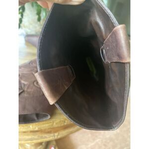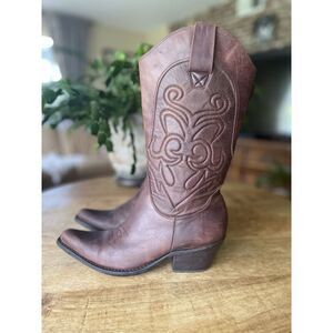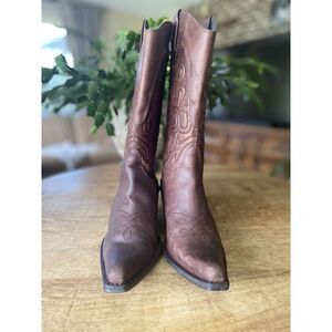 Women’s western-style cowboy boots by High Noon. Size 8.5 M. Made in Brazil. Leather upper with man-made balance. Rich brown color with traditional western embroidery on the shaft and vamp. Pointed toe, angled stacked heel, and pull tabs for easy on and off. Gently worn—moderate scuffing on toes and outsoles (see photos). Minor cosmetic flaw on the back of one heel (visible in photos), but overall in good pre-owned condition. Soft, supple leather with a beautiful worn-in patina.