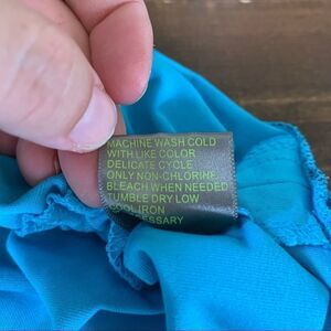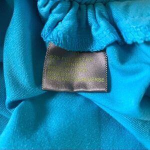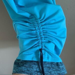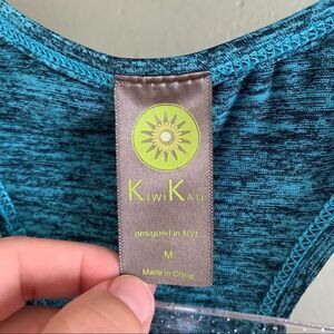 Women's Kiwi Kate racer back athletic tank in size M. Color is teal with dark teal/gray trim on straps and at bottom. Ruche accent on sides. Gently worn.
