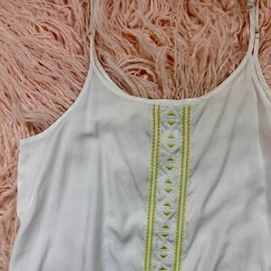 Woman's large white nightgown from Gilligan & O'Malley. Down the very center of the nightgown is an Aztec print in highlighter yellow thread and the straps are adjustable. Made in China, this has been machine washed and is ready for immediate wear.