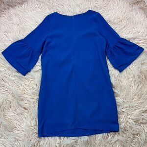 Large, woman’s cobalt blue, bell sleeve,V-neck dress. Above the knee length, 1/2 bell sleeves with v-neckline. Dress is lined and has great movement, sheath style. New with tags! There is some small discolorations as shown on the front of the dress.