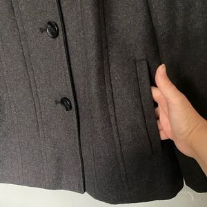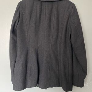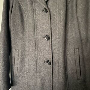 Womens London Fog Charcoal gray pea coat size small in great condition. Single breasted , 2 front pockets. Wool blend. Doesn’t have material tag . Armpit to armpit is 18.5” flat.