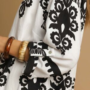 Elegant black and white midi baggy mid-length dress with intricate patterns. Perfect for any occasion.