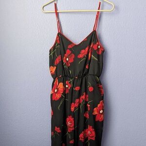 Women's jumpsuit. Sleeveless with adjustable spaghetti straps. Elastic band around waist. Black with red floral print throughout. Has pockets. Wide leg. Brand: Love & Piece Collective