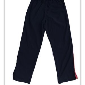 Black pants with a pink and white stripe. Has a pocket at each hip and drawstring waist. There is a slit at each ankle. 30in inseam. In good condition