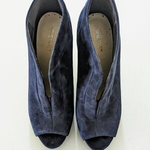 Women's heels. Boot heels / Booties. Open toe with a deep V opening. Suede. Dark Blue. Heel is about 4". Sole about 0.5". Overall good condition.