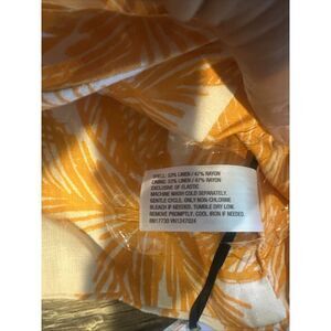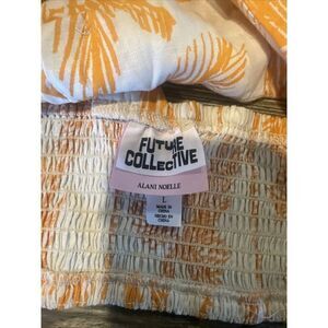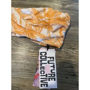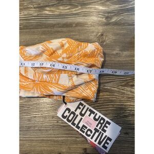 The Women's One Shoulder Bralette Top by Future Collective in size Large is a stylish and versatile piece perfect for various occasions. Made from a linen blend fabric in a vibrant orange color with a palm tree pattern, this top features pleated and elastic straps for a comfortable fit. The pullover closure and wide strap design make it easy to wear and care for, while the lightweight and stretchy material makes it ideal for summer, fall, and spring seasons. Perfect for travel, parties, casual wear, or work, this bralette top combines a hipster and nature-inspired theme that is both trendy and comfortable.