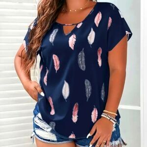 Plus Size Elegant Top, Women's Plus Feather Print Cut Out V Neck Short Sleeve Curved Hem Tee Navy Blue