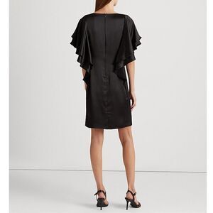 Smooth satin lends a glossy sheen to Lauren Ralph Lauren's luxurious cocktail dress, characterized by dramatic cascading ruffles at the sleeves. Cut for an easy shift silhouette, this style embodies effortless glamour.