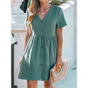 Women's Seersucker Button-Front Mini Dress Short Sleeves Dresses V Neck Dressin