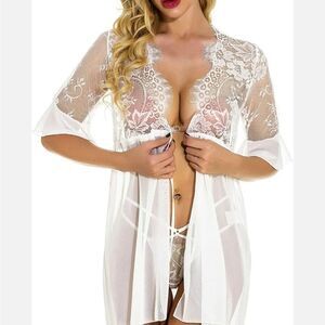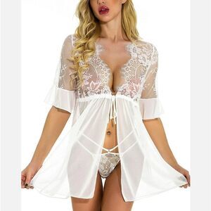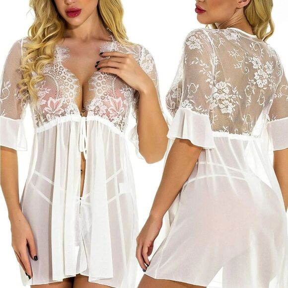 95% Polyester, 5% Acryliclingerie for women, boudoir lingerie, lingerie robe, ladies lingerie, negligee lingerie, maternity lingerie, babydoll lingerie for women, women robes, open front baby doll lingerieStyle: Women's V Neck See Through Lingerie Open Front Babydoll Lace Chemise Sleepwear Mesh Robe Sheer Nightgown with G-StringThis babydoll lingerie nightie dress features v neck, flare sleeve, and open front. You can wear it as a babydoll lingerie, sheer robe or lingerie cover upOccasion: Nightwear, Sleepwear. Perfect for honeymoon night, wedding nights, lingerie party, anniversaries, valentine's day, bedroom, sleeping, bathing, or special nights with your loverPackage Content: 1 x Women Lingerie Sleepwear with G-String