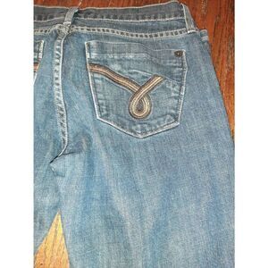 Good Used Condition (Has fraying from wear at ankles- please see pictures) Women's Waist Size 27" Blue Denim James Jeans Low-Mid Rise Dry Aged Denim James Dublin Braided Blue Jeans with Pockets and Belt Loops.