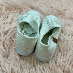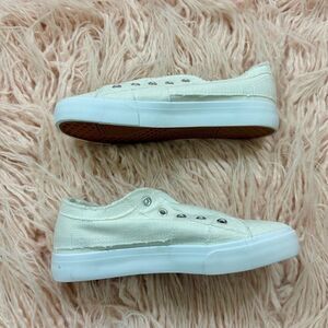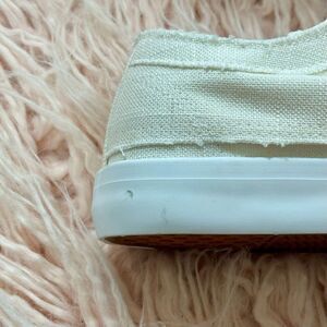 Size 6, off white canvas slip on shoes. They look like they should hold laces but instead secured with elastic on the insides. Distressing along the hemlines with a little leather patch on the outsides of the shoes. There is a small scuff on the right outside heel and some black marking on the inside of the left sole as shown.