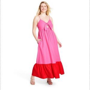 This Sleeveless Tie-Front Midi Dress from Tabitha Brown for Target is a stylish must-have for summer occasions. This long, sleeveless dress features a V-neck silhouette with front tie, and has a bright pink and red colorblock design. A lightweight fabric blend keeps you comfy, and there are side pockets for stashing your keys or phone.