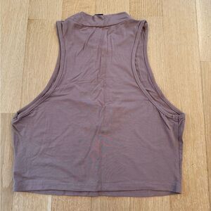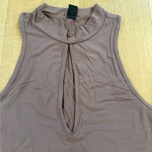 This stylish tank top from SHEIN features a sleeveless design in brown. The top is crafted with a mandarin collar and a chic cut-out detail at the front, adding a modern twist to its cropped silhouette. Made from a soft, stretchy fabric, it ensures comfort and a flattering fit. In a size medium.