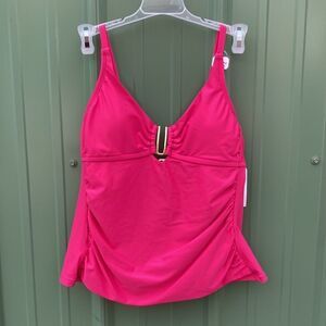 Relaxing vacation look: complete. You’ll be ready in this Swim Tankini. Pair this swim top with matching bottoms (sold separately) or mix and match for a super-cute and colorful twist. This tankini top includes gold-tone hardware detailing, adjustable straps for a comfortable fit and removable cups for support. Crafted in stretch fabric, this tankini top moves with you when you’re in or out of the water.