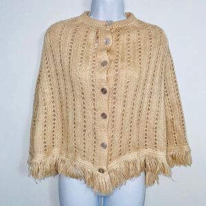 Womens Sweater Shawl Beige Sleeveless Cable Knit Button Down Outwear Fringe