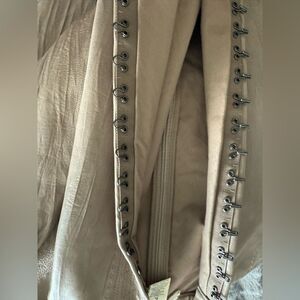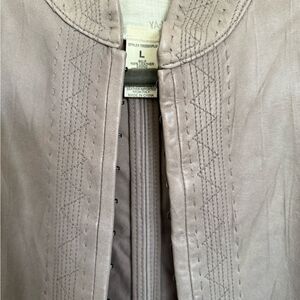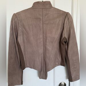 Elevate your style with this chic taupe cropped leather jacket. Perfect for any occasion, it offers a sophisticated look with its sleek design and comfortable fit.side sleeve zippers,hook and eye closure and internal corset for a form fitting cut. The sleeves are partly knit for comfort. Great over a cool dress!! In great condition!!!