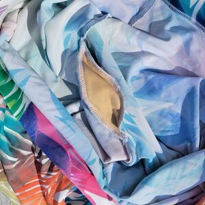 • Beautiful tropical print in pink, teal, purple, green, and orange hues