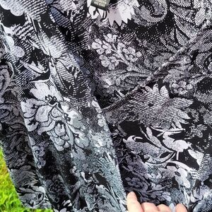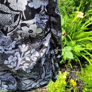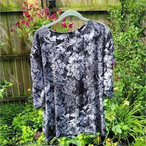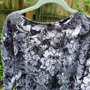 Womens Black and white flowered pattern V-Neck top. The side seams gather up a little bit. Short Sleeve