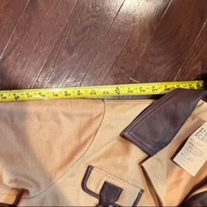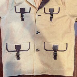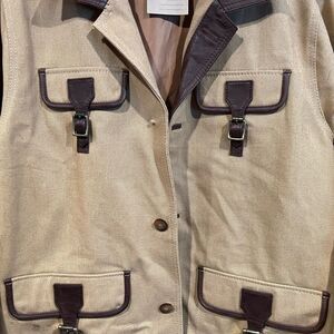 •Women's Tan Jacket with Leather Details, Four Pockets. Utility Straps, 3 Buttons, Size Small.