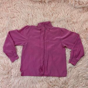 Vintage Macy's Young Collector blouse in the most barbiecore, bubblegum pink. 100% silk, band collar which features a keyhole cutout on the chest. There is a small oil stain on the very front of the blouse.