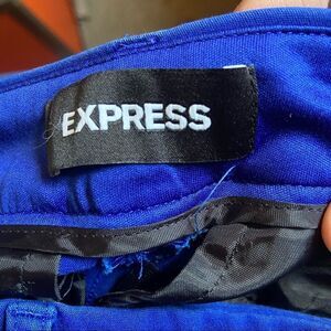 These pants from Express Are blue, they are a mid rise ankle and they have two pockets with zippers and two other pocket that do not function that are just there for decoration.