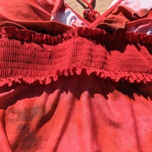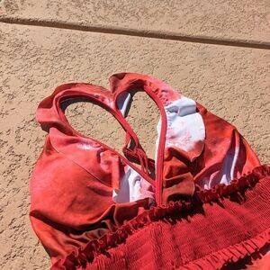 Women's super cute, marble red/white color, ruffle/open v-neck bust, one piece swimsuit with adjustable shoulder straps and padding in the chest.