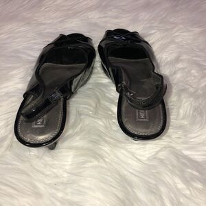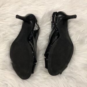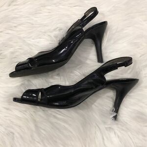These open toe heels are comfy and cute! There is some wear but they still look great! approxiamtely 2" heels