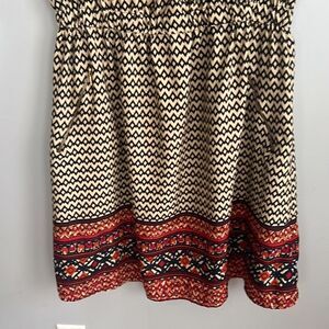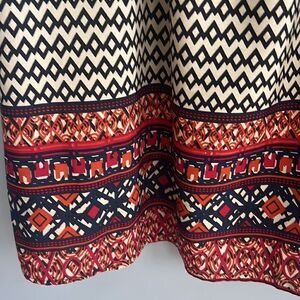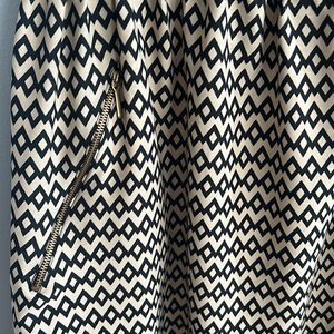 The waist is stretchy and very comfortable and there are two zippered pockets in the front. The geometric print of the dress is very flattering and there is an accent of a geometric print at the bottom. Very light and breezy.