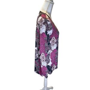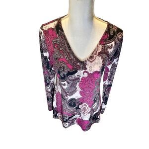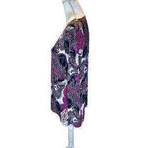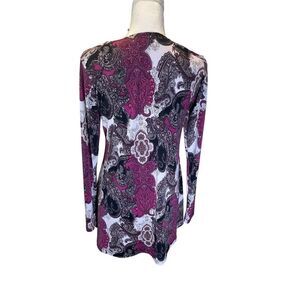 Women with Control (Renee Greenstein) tunic in a Women’s Size Small. Vneck. Tunic depicts an all over paisley pattern. Colors include black, gray, purple, violet, and white. 95% polyester and 5% spandex. Backside of top is longer than the front providing good coverage. Item is Preowned and in good condition. Contact me with any questions.