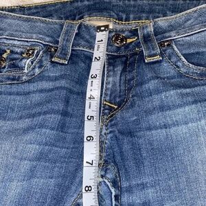 Women's True Religion World Tour Joey Retro low waist bootcut Jeans. With classic embroidered flap pockets, tiny bit of distressed on hem. Great medium wash blue, in great condition, only worn a few times. Super soft. SIZE - 27
