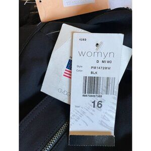 These Womyn black pants in size 16 offer a sleek and stylish look. Made from a comfortable blend of polyester and spandex, the All About Zips Style PM1472MW is US-made and requires dry cleaning.