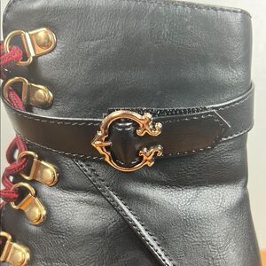 Step out in style with these chic black leather ankle boots. Featuring striking red laces, these boots offer both comfort and fashion-forward design. Perfect for any occasion.