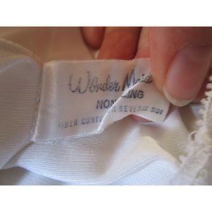 Vintage Wonder Maid full slip in white with delicate lace trim. Features non-cling Antron polyester fabric, metal findings, and a size 32 fit. Minor underarm yellowing noted. Shows loose threads, pilling, pulling. Will arrive wrinkled. May show defects in manufacture and decoration. Vintage 1960's - 1970's.