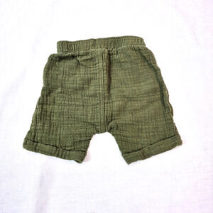 * Bottoms: Dark green linen-style shorts with elastic waistband