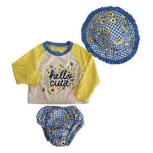 Oh so cute baby girl 3 piece summer set features a plaid and floral bee print, set includes a matching shirt, bottoms and a hat.
