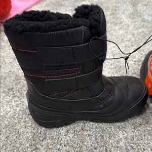Cozy black boots featuring vibrant pink straps. Ideal for winter adventures.