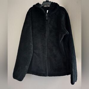 Wonder Nation black sherpa hooded jacket with front zip and pockets girls size large 10/12. Pre owned