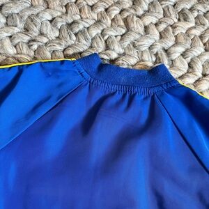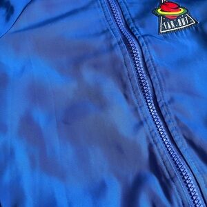 Vibrant blue kids' jacket featuring a colorful rainbow patch. Stylish and fun for any occasion. Has small faint stain on front and a little faint white on the back near the neck that I think would wash out. (See last 2 photos) Otherwise good condition. 12 months but was worn through 18 months.