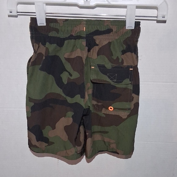 Trendy camouflage swimming trunks with a vibrant orange accent. Ideal for summer fun and comfort.