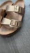 Comfortable tan sandals with double straps and metallic buckles. Ideal for everyday wear.