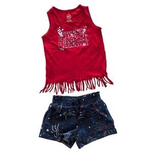 Perfect outfit for the 4th! Red tank top with fringed bottom says Sweet Land of Liberty. Bottoms are navy blue with fireworks.