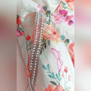 Excellent pre-owned condition, it's a Girls size 10, High Low Dress in gorgeous teal blue color and orangish peach, with a lovely floral design with bows on the shoulders and fabulous rhinestone embellished pockets! No holes, rips, or stains! The zipper functions properly, multi layers give it that classy poofed out Princess Look.