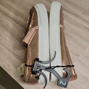 These Wonder Nation sneakers feature a stunning gold and white color scheme with a luxurious metallic upper. The slip-on design is complemented by a unique layered ruffled effect, while the white rubber sole adds a stylish contrast. Enjoy comfort with the padded collar that enhances the fit.